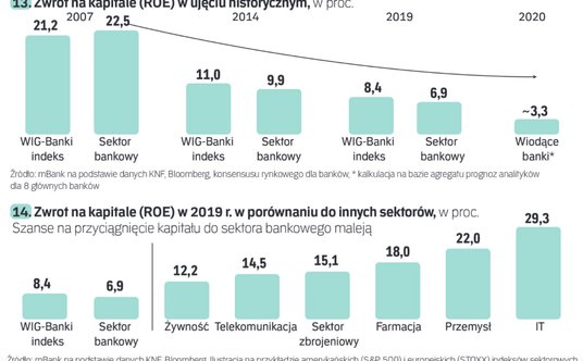 • W 2019 r. wygenerowanie przez banki umownego 1 mld zł zysku wymagało aż 14,5 mld zł kapitału. Dla porównania, sektory przemysłowy i IT, by wygenerować miliard złotych zysku, potrzebowały odpowiednio 4,5 i 3,4 mld zł. Jeśli prognozy analityków się potwierdzą, to okaże się, że w 2020 r. banki będą potrzebowały ponad 30 mld zł kapitałów dla wygenerowania 1 mld zł zysku.