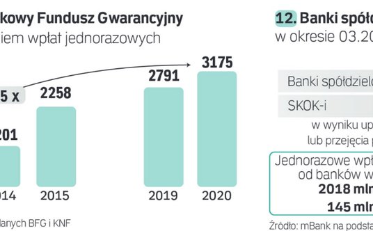 • W 2019 r., według raportu KNF, cztery banki komercyjne i 17 banków spółdzielczych nie spełniało minimum regulacyjnego powiększonego o tzw. wymóg połączonego bufora. Niedobór ten wyniósł łącznie 3,2 mld zł. W tym przypadku to również banki komercyjne będą musiały zrzucić się na ewentualną akcję ratunkową dla wspomnianych instytucji.