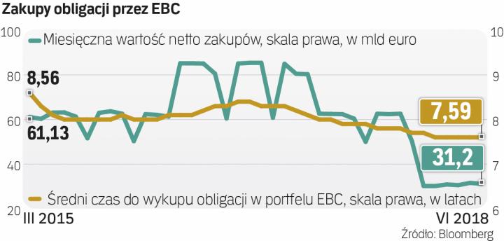 Rada Prezesów ogłosiła wówczas, że program QE, w ramach którego instytucja ta skupuje za wykreowane pieniądze instrumenty dłużne za 30 mld euro miesięcznie, od września zostanie ograniczony, a z końcem roku całkowicie wygaszony. Zapowiedziała też, że podwyżka stóp procentowych, która może być kolejnym krokiem do normalizacji polityki pieniężnej, jest możliwa najwcześniej po lecie 2019 r. Jeszcze długo po wygaszeniu QE EBC będzie też reinwestował wpływy z zapadających obligacji ze swojego portfela.