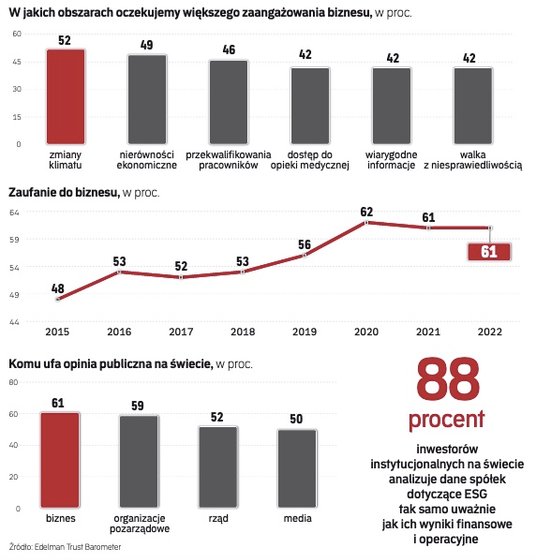 Prawie trzy czwarte (73 proc.) menedżerów różnych właścicieli aktywów wskazało w globalnym badaniu MSCI Investment Insights 2021, że planują zwiększyć inwestycje w spółki, które dobrze wypadają pod względem ESG. Według analizy Bloomberg Intelligence wartość światowych inwestycji w aktywa ESG, która sięga już 41 bln dol., ma w 2025 r. przekroczyć 53 bln dol., czyli jedną trzecią całego rynku zarządzanych aktywów. Inwestorzy instytucjonalni przy podejmowaniu decyzji zwracają coraz większą uwagę na kwestie związane ze zrównoważonym rozwojem. W badaniu PwC prawie 30 proc. inwestorów stwierdziło, że jest skłonnych obniżyć wycenę lub wycofać się z inwestycji, jeśli uznają czynniki ryzyka ESG za zbyt wysokie. O coraz silniejszej presji na rzetelne i przejrzyste raportowanie ESG mówią szefowie spółek. Według ubiegłorocznej ankiety firmy KPMG aż 76 proc. top menedżerów z Polski dostrzega u interesariuszy wyraźną potrzebę zwiększenia sprawozdawczości i przejrzystości w obszarze ESG. Większość (53 proc.) badanych szefów oceniła, że największym źródłem presji są inwestorzy instytucjonalni. Mniej istotny okazał się nacisk organów regulacyjnych (16 proc.), który dla polskich szefów ma mniejsze znaczenie niż presja pracowników i kandydatów do pracy (26 proc.).