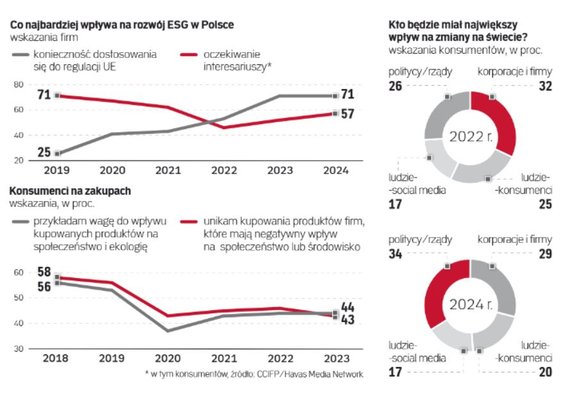 Na tle presji regulacji mniej istotne są teraz dla firm oczekiwania interesariuszy, w tym klientów i pracowników. Wprawdzie ich wpływ na zrównoważony rozwój w Polsce nadal docenia sporo, bo prawie sześć na dziesięć badanych przedsiębiorstw, ale już wyraźnie mniej niż przed pięcioma laty (71 proc.). Firmy najwyraźniej na co dzień zauważają zmiany w podejściu konsumentów, które pokazało badanie Havas.