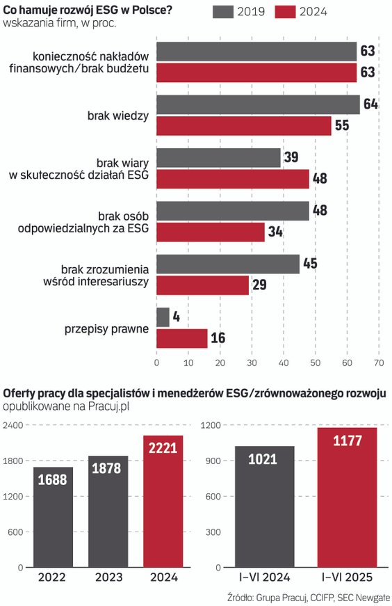 Zdaniem dyrektorki CSRinfo, lepsze warunki do działania mają specjaliści i menedżerowie ESG w spółkach, w których choć jeden z członków zarządu rozumie sens zrównoważonej transformacji i długofalowe korzyści, jakie przynosi ona firmie. Pomogły tu dyrektywy dotyczące raportowania niefinansowego, w tym zwłaszcza CSRD, która w pierwotnej wersji zwielokrotniła liczbę firm objętych tym obowiązkiem. Jak podkreśla Ewa Zamościńska, zarówno dzięki CSRD, jak też innym regulacjom Unii (w tym rozporządzeniu SFDR czy zrównoważonej taksonomii), ESG stało się w ostatnich trzech latach ważnym tematem biznesowym, związanym z zarządzaniem ryzkiem. W rezultacie wszedł on w obszar zainteresowania zarządów a szczególnie dyrektorów ds. finansowych (CFO). Tym bardziej że o kwestie i wskaźniki niefinansowe zaczęły pytać banki, ubezpieczyciele i analitycy giełdowi.