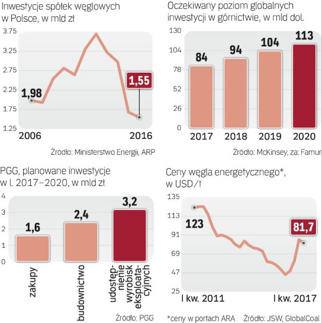 W związku ze wzrostem cen węgla poprawia się sytuacja producentów tego surowca, którzy zapowiadają odbudowę mocy wydobywczych. Polska Grupa Górnicza (PGG) do 2020 r. wyda na inwestycje 7,2 mld zł, z czego zakupy maszyn i urządzeń pochłoną 1,6 mld zł. – Tylko w tym roku na inwestycje, w tym także drążenie wyrobisk, wydamy ponad 1,4 mld zł – informuje Tomasz Głogowski, rzecznik prasowy PGG.