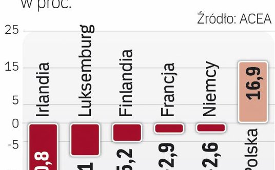 To znaczące spowolnienie, bo od początku roku sprzedaż zwiększyła się o 6,2 proc. Niepokojące jest zwłaszcza to, że mniej niż przed rokiem kupują Niemcy, Francuzi, Irlandczycy i – co najbardziej zrozumiałe – Brytyjczycy. Spadek motoryzacyjnego entuzjazmu widać także w Hiszpanii oraz w krajach bałtyckich. Polska ze wzrostem na poziomie 14,2 proc. w lutym i 16,9 proc. od początku roku plasuje się wśród państw o największym popycie. Najdynamiczniej wzrosła sprzedaż w Grecji, bo aż o 56 proc. Ale Grecy ruszyli do salonów, obawiając się nowych kłopotów gospodarczych, więc inwestują w dobra trwałe.