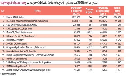Podobnie jak w przypadku całego kraju również najwięcej towarów i usług ze Świętokrzyskiego trafia do naszych zachodnich sąsiadów. Jak wynika z nieoficjalnych danych Ministerstwa Rozwoju eksport z województwa do Niemiec wyniósł w 2015 r. ponad 1,5 mld zł, co przekłada się na 21 proc. całości eksportu z regionu. W następnej kolejności towary ze Świętokrzyskiego trafiają do Wielkiej Brytanii (653,8 mln zł) i Holandii (579,3 mln zł). W pierwszej dziesiątce są jeszcze Czechy, Słowacja, Włochy, Francja, Szwecja, Węgry i Austria.