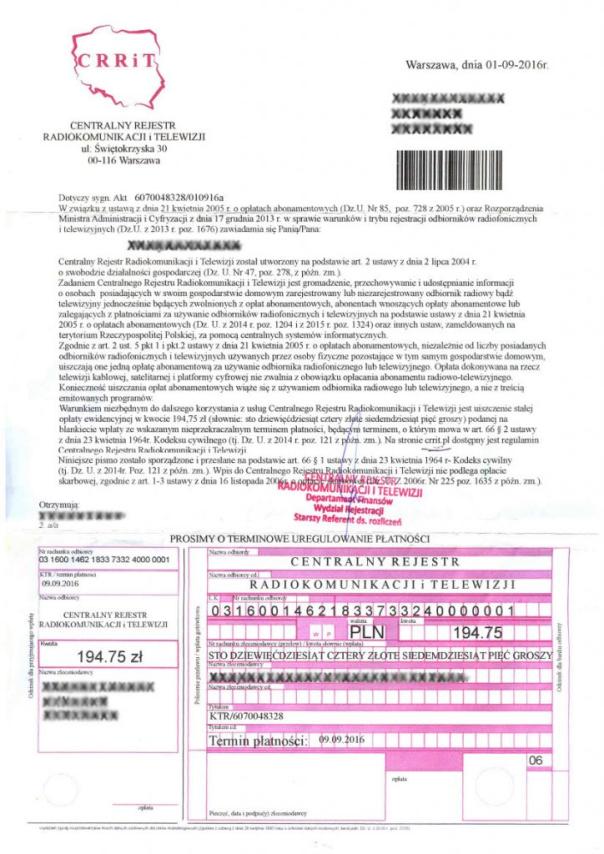 Poczta Polska w komunikacie poinformowała, że jej konsultanci telefoniczni od 5 września dostają informacje od osób, które otrzymały pismo wysłane przez Centralny Rejestr Radiokomunikacji i Telewizji. W dokumencie instytucja, powołując się na ustawę o opłacie abonamentowej i rozporządzenie Ministerstwa Administracji i Cyfryzacji, wzywa odbiorcę do zapłaty 194,75 zł opłaty abonamentowej. Podkreśla, że nie zwalnia z tego uiszczanie abonamentu za telewizję kablową, satelitarną czy cyfrową. Do pisma, opatrzonego pieczęcią o podpisem pracownika Centralnego Rejestru, dołączono szablon przekazu pocztowego na podaną kwotę.