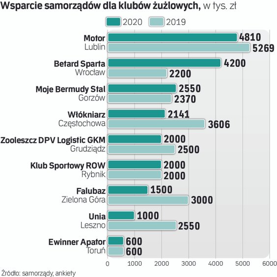 Z danych zebranych przez „Rzeczpospolitą" wynika, że w 2020 r. kluby żużlowej najwyższej klasy rozgrywkowej otrzymały od samorządów 20,8 mln zł. Swoje piętno odcisnęła jednak pandemia. Rok wcześniej wysokość wsparcia wyniosła prawie 24,1 mln zł. Na największy zastrzyk gotówki mógł liczyć lubelski Motor. Trafiło do niego 4,8 mln zł. 4,2 mln zł trafiło z kolei do Betardu Sparty Wrocław. Stolica Dolnego Śląska wykazuje dużą aktywność we wspieraniu klubów sportowych. Pieniądze przeznaczone na zespół żużlowy stanowiły jedną czwartą pomocy dla klubów występujących w najwyższych klasach rozgrywkowych w 2020 r.