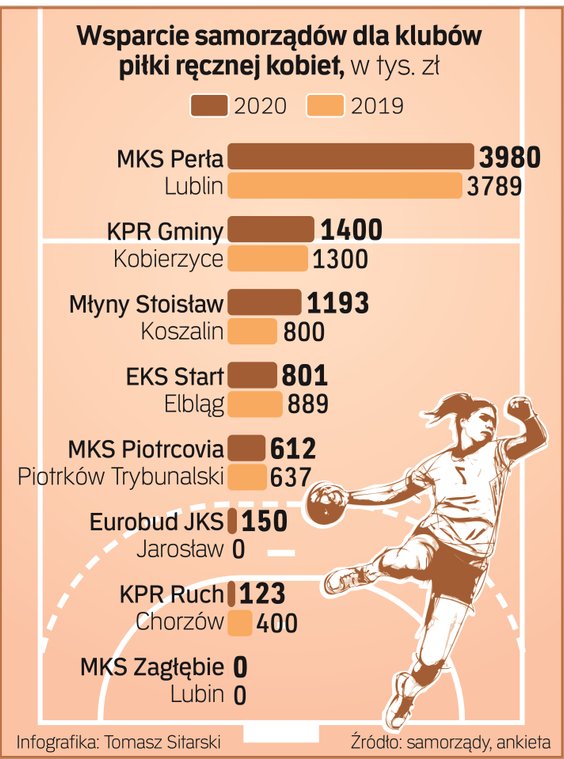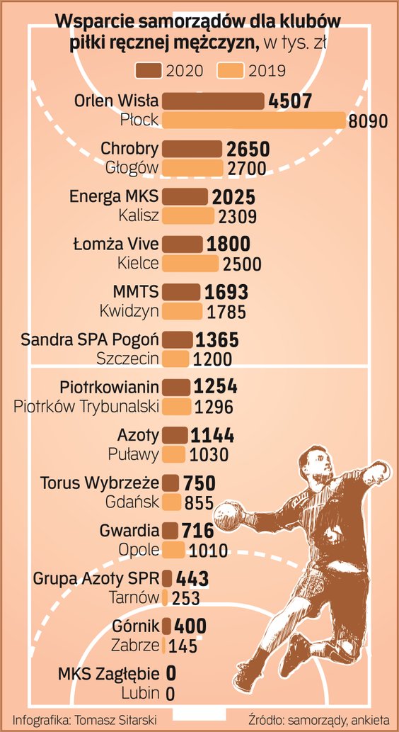 Pierwsze kroki władze klubów kierują najczęściej do ratusza. Poprzez uczestniczenie w sportowej rywalizacji promuje się miasto, więc składanie wniosku o samorządową dotację wydaje się naturalną koleją rzeczy. Z danych zebranych przez „Rzeczpospolitą" wynika, że w 2020 r. kluby grające w Superlidze otrzymały od samorządów 18,7 mln zł. W przedpandemicznym 2019 r. kwota wsparcia była znacznie wyższa, przekraczając 23 mln zł.
