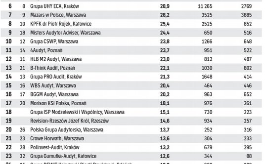 Natomiast diametralnie inny obraz rysuje się, jeśli za wspólny mianownik przyjmiemy sumę aktywów badanych spółek bądź ich przychody. W tej pierwszej wersji aż 40 proc. rynku przypada na KPMG, niemal 23 proc. na Deloitte, ponad 18 proc. na PwC, a 14,6 proc. na EY. W takim ujęciu wielka czwórka ma niemal 96 proc. rynku (o ponad 1 pkt proc. mniej niż rok wcześniej).
