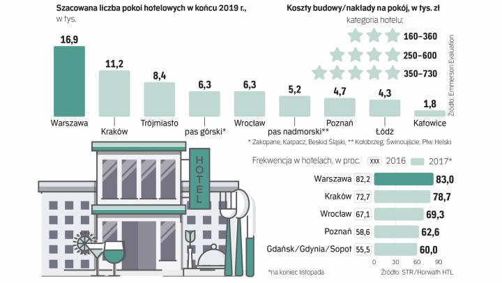W najbliższych dwóch latach liczba miejsc w warszawskich hotelach ma się zbliżyć do 16,9 tys., w Krakowie przekroczy 11,2 tys., w Trójmieście wzrośnie do 8,4 tys. Jak wynika z analiz wyceniającej nieruchomości firmy Emmerson Evaluation, do końca 2019 r. łączna liczba pokoi hotelowych w Polsce ma się zwiększyć o przeszło 30 proc. w porównaniu z końcem 2016 r., a w niektórych lokalizacjach wzrost sięgnie 50 proc. Inwestorów przyciąga rosnący popyt na usługi hotelowe, a także korzystne perspektywy gospodarcze. Znaczenie ma również poprawiająca się infrastruktura transportowa czy rozwijana siatka połączeń lotniczych.