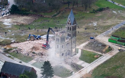 Rozbiórka wież neoromańskiej katedry św. Lamberta w Immerath
