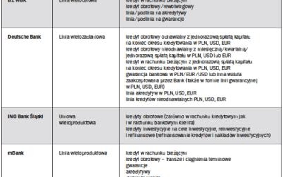 Na takich samych zasadach przedsiębiorcom oferowane są linie wieloproduktowe, które tworzą całe pakiety usług finansowych: kredyty, gwarancje, akredytywy a nawet, jak w BOŚ – faktoring. To oznacza, że podpisuje się jedną umowę a przyznany limit wykorzystuje według potrzeb. Limit jest przyznawany najczęściej na rok, ale w BOŚ są to 24 miesiące, w przypadku kredytu inwestycyjnego nawet 60 miesięcy a w Deutsche Banku 3 lata. W Millennium natomiast sam limit przyznawany jest na rok, ale linia na gwarancje i akredytywy na 3 lata a karty płatnicze na 4 lata.