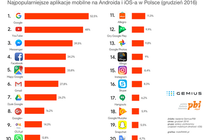 Powstały pierwsze wyniki badań popularności aplikacji mobilnych w Polsce. Raport przygotowało Gemius i Polskie Badania Internetu - PBI i dotyczy on Androida i iOSa w Polsce za miesiąc grudzień 2016 r. Kwestią sporną jest jednak, na ile tego typu zestawienia odpowiadają rzeczywistości. Gemius i PBI odpowiadają.