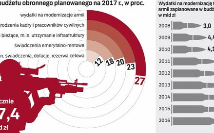 W tym roku zaczęła obowiązywać ustawa podnosząca wydatki na obronność z 1,95 do 2 proc. PKB. Oznacza to budżet na poziomie 35,9 mld zł, w tym ok. 10 mld zł na wydatki majątkowe, czyli modernizację armii. – W mojej ocenie MON w tym roku nie ma już szans na zrealizowanie zakupowych planów wartych co najmniej 3 mld zł. To ogromna dziura, bo prawie trzecia część tegorocznego budżetu modernizacyjnego – martwi się gen. Waldemar Skrzypczak, były wiceminister obrony w rządzie PO–PSL. Przyczyna? Jego zdaniem pod hasłem niezbędnej korekty planów inwestycyjnych, porządkowania rynku i kierowania jak największej liczby zamówień do rodzimej zbrojeniówki nowa ekipa unieważniła kilka przetargów, m.in. na śmigłowce czy elektroniczne systemy zarządzania polem walki. Do tego zaś widzimy, że hamują największe programy unowocześniania sił zbrojnych, a zamiast większych nakładów na szkolenie i sprzęt zafundowano kadrze podwyżki.