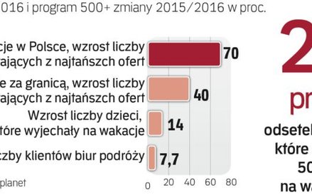 22 proc. beneficjentów najpopularniejszego programu rządu Prawa i Sprawiedliwości zadeklarowało, że pieniądze z 500+ pójdą na sfinansowanie wakacji dla dzieci. Wyraźnie także widać, że rodziny, które z tego programu korzystają, najchętniej spędzają wakacje w kraju i wybierają najskromniejszą opcję. Aż 70 proc. badanych przez Travelplanet stwierdziło, że zdecydowało się na wypoczynek w obiektach mających od zera do trzech gwiazdek, czyli o najniższym standardzie. Co ciekawe, taką opcję za granicą wybiera tylko 40 proc. badanych.