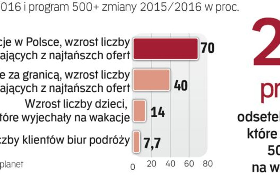 Rządowy program 500+ pomógł polskim dzieciom wyjechać na wakacje – wynika z badań przeprowadzonych przez multiagenta turystycznego Travelplanet.pl. Ten efekt może być jeszcze silniejszy w 2017 r. Oczywiście, jeśli zostanie spełnionych kilka warunków, w tym najważniejszy: wydłużenie szczytu popytowego na usługi turystyczne dzięki zróżnicowaniu terminów szkolnych wakacji letnich, podobnie jak jest to dzisiaj z feriami zimowymi.