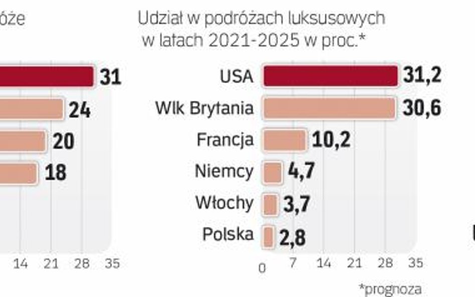 Światowy rynek podróży luksusowych ma dzisiaj wartość ok. 186 mld dolarów. Polski udział wynosi w tej chwili 0,2 proc. Jak jednak wynika z raportu „Shaping the future of luxury travel" firmy Amadeus – wiodącego dostawcy zaawansowanych rozwiązań technologicznych dla światowej branży turystycznej i lotniczej – do roku 2025 ma się zwiększać w tempie najszybszym na świecie. Podczas gdy globalna średnia wzrostu wynosi 6,2 proc. rocznie, to w przypadku Polski średnie skumulowane tempo wyniesie 12,8 proc. i w roku 2025 polski udział w świecie globalnego turystycznego luksusu wyniesie już 1,5 proc.