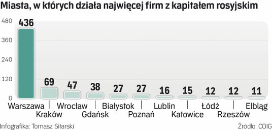 Wedle danych Centralnego Ośrodka Informacji Gospodarczej na 27 stycznia tego roku, w Polsce działały 982 spółki, w których udziałowcem jest rosyjska firma lub obywatel Rosji. Ponad połowa, bo 507, ulokowała się w województwie mazowieckim. Najwięcej spółek z kapitałem rosyjskim działa w obszarze transportu drogowego towarów (71), sprzedaży hurtowej niewyspecjalizowanej (49) i działalności związanej z oprogramowaniem (48). 18 prowadzi sprzedaż hurtową paliw, 14 sprzedaż hurtową wyrobów chemicznych. Nie brakuje wśród nich firm znanych i ważnych. Wystarczy wspomnieć Grupę Azoty, Europol Gaz, sieć stacji benzynowych Amic czy producenta oprogramowania antywirusowego Kaspersky.