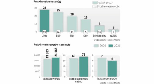 Rynek współdzielonych rowerów, hulajnóg i skuterów mocno odczuł pierwszy rok pandemii, gdy popyt na te pojazdy w polskich miastach skurczył się o 60–80 proc., a część operatorów wręcz zamknęła biznes lub wycofała się z Polski. Rok 2021 przyniósł jednak odwilż i Polacy ponownie postawili na dwa kółka pożyczane na minuty. Jak wynika z najnowszego raportu stowarzyszenia Mobilne Miasto, który „Rzeczpospolita” publikuje jako pierwsza, popularność takich pojazdów wróciła do poziomów sprzed pandemii, a w niektórych przypadkach przerosła je o 10 proc. W sumie w szczycie sezonu w Polsce dostępnych do wynajmu było łącznie niemal 69 tys. jednośladów, a to o 58 proc. więcej niż rok wcześniej.