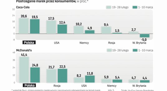 Ciekawa sytuacja ma miejsce w przypadku innej marki, która również zderzyła się z opinią konsumentów krytykujących ją za opieszałość w podejmowaniu decyzji o zamknięciu rosyjskich lokali. O ile Coca-Cola w naszym kraju nieznacznie straciła wizerunkowo, przynajmniej na razie, o tyle w przypadku McDonald’s straty są ogromne. – Największe straty wizerunkowe marka poniosła właśnie w naszym kraju, to jeden z największych spadków wskaźnika w historii. Na innych rynkach to nie jest aż tak widoczne – dodaje.