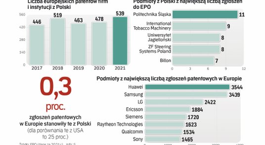 Najnowsze dane Europejskiego Urzędu Patentowego (EPO), które publikujemy jako pierwsi, mogą napawać optymizmem. W ub.r. do tego organu wpłynęło 539 zgłoszeń patentowych złożonych przez polskie przedsiębiorstwa, uczelnie wyższe i instytuty badawcze. To świetny wynik, bo oznacza wzrost rok do roku o prawie 13 proc. Tymczasem w czasie pandemii aktywność wielu firm w Europie pod względem ochrony praw własności intelektualnej wyraźnie siadła – łączna liczba zgłoszeń do EPO zwiększyła się o ledwie 4,5 proc., a w niektórych krajach spadła (w Czechach o 1,5 proc., Irlandii – o 2,4 proc., a Słowenii – aż o 30 proc.).