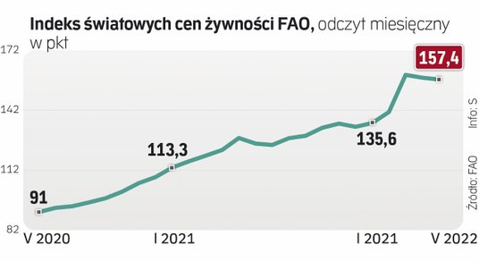 To, co dzieje się na światowych rynkach żywności, śledzi Organizacja Narodów Zjednoczonych ds. Wyżywienia i Rolnictwa (FAO). Po wybuchu wojny w Ukrainie, w marcu, wyznaczany przez nią indeks światowych cen żywności sięgnął 159,7 pkt. To gigantyczny skok, aż o ponad 18 pkt, czyli o blisko 13 proc., w porównaniu z również rekordowym lutym. Indeks znalazł się tym samym na najwyższym poziomie w historii notowań, czyli od 1990 r. Kwiecień dość zaskakująco przyniósł lekki spadek indeksu do 158,5 pkt. W piątek FAO podała odczyt za maj. I okazało się, że indeks cen znów lekko spadł do 157,4 pkt (o 0,6 proc.) w porównaniu z kwietniem. To jednak i tak aż o 29,2 pkt (22,8 proc.) więcej niż w tym samym okresie zeszłego roku.