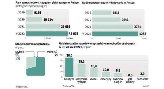 Jeszcze dziś mieścimy się w limicie AFIR z uwagi na małą liczbę elektryków. Ale jeśli już teraz na jeden punkt ładowania przypada 11,5 auta, to wkrótce będzie ich coraz więcej. I trudno będzie tę proporcję zmniejszyć: jeśli w ostatnich dwóch latach liczba aut z elektrycznym napędem (czysto elektrycznych i hybryd plug-in) zwiększyła się pięciokrotnie – z 11,7 tys. w kwietniu 2020 r. do prawie 46,6 tys. w kwietniu 2022 r., to w tym samym czasie liczba ogólnodostępnych punktów ładowania wzrosła tylko dwukrotnie: z 2,1 tys. do 4,2 tys.