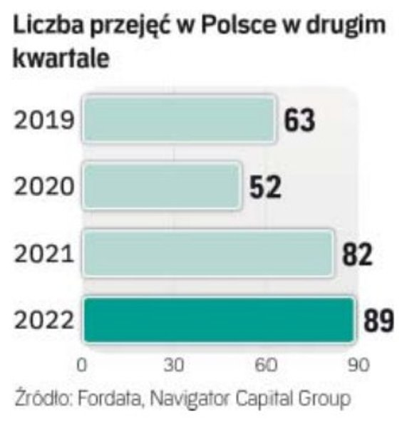 – W drugim kwartale, mimo trudnej sytuacji geopolitycznej i gospodarczej, rynek M&A miał się dobrze, a liczba transakcji była zbliżona do rekordów z 2021 r. Część transakcji była wymuszona ze względu na konieczność dezinwestycji aktywów na rynku rosyjskim – podkreśla Artur Wilk, analityk Navigator Capital Group.