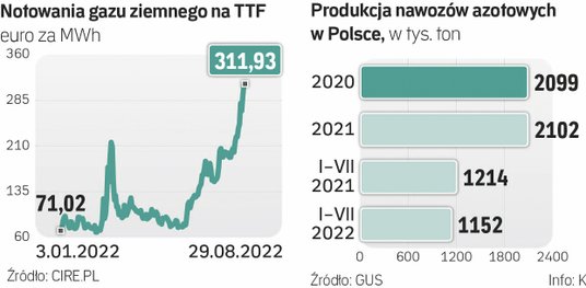 Po wznowieniu produkcji nawozów w Anwilu ich cena ma odzwierciedlać aktualną cenę gazu i uwarunkowania rynkowe. Ponadto spółka czeka na stabilizację sytuacji na rynku gazu i wypracowanie rozwiązań wspierających branżę nawozową. Niespełna tydzień temu, gdy Orlen podawał informację o wstrzymaniu produkcji z powodu wysokich cen gazu, kurs surowca na rynku TTF wynosił ok. 280 euro. W poniedziałek rano przekraczał 300 euro.