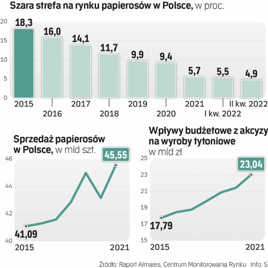 Zgodnie z raportem firmy KPMG, szara strefa tytoniowa w UE w 2021 r. wyniosła 8,1 proc. Polska, z wynikiem 4,9 proc., plasuje się więc poniżej unijnej średniej. W naszym kraju odnotowano też drugą najwyższą w UE dynamikę spadku konsumpcji papierosów z przemytu.