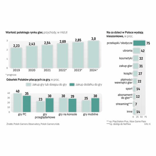 Badanie, które „Rzeczpospolita” publikuje jako pierwsza, wskazuje, że urządzenia mobilne to ulubiona platforma do grania. 60 proc. polskich dzieci sięga do niej codziennie (przy czym w ogóle w gry wideo nad Wisłą gra 85 proc. małoletnich). Na taką rozrywkę wydają pieniądze z kieszonkowego. To od rodziców dostaje 81 proc. dzieci. W przypadku co trzeciego ankietowanego małoletniego kieszonkowe przeznaczane jest właśnie na zakup gier (zarówno na konsole, komputery, jak i smartfony), przy czym decydują się na to głównie chłopcy (48 proc. przy 14 proc. dziewczynek). 22 proc. respondentów dokonuje z kieszonkowego mikropłatności w grach, a 12 proc. opłaca abonament serwisów gamingowych (np. PlayStation Plus lub Xbox Game Pass). Jak wyjaśnia Rodzińska-Szary, to zupełnie unikatowe statystyki.