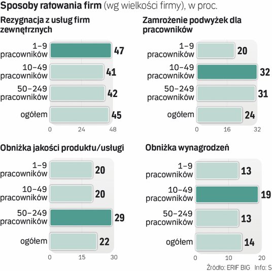 Pierwszym krokiem, jaki podejmują lub są gotowi podjąć przedsiębiorcy, żeby zachować stabilność finansową swojej firmy, jest rezygnacja z usług podmiotów zewnętrznych, np. sprzątających, reklamowych, ubezpieczeniowych. Tak zadeklarowało 45 proc. ankietowanych właścicieli lub zarządzających firmami w badaniu przeprowadzonym na zlecenie ERIF Biura Informacji Gospodarczej. Najbardziej skłonni do podjęcia takiej decyzji są najmniejsi przedsiębiorcy, którzy zatrudniają od 1 do 9 osób (47 proc. wskazań). Co istotne, spośród przedsiębiorców deklarujących takie działanie, aż 84 proc. odpowiedziało, że zrobiliby to w pierwszej kolejności.