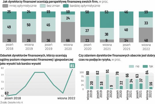 Na skutek obaw związanych z rozwojem sytuacji geopolitycznej, inflacji, spadku siły nabywczej pieniądza dyrektorzy finansowi przejawiają niespotykaną w historii badania niepewność. Wskaźnik netto liczby odpowiedzi wskazujących na znaczący poziom nieufności finansowej i gospodarczej wzrósł z 48 proc. (jesień 2021 r.) do 77 proc. (wiosna 2022 r.). A odsetek dyrektorów finansowych, którzy oceniają ogólny poziom niepewności finansowej i gospodarczej jako wysoki lub bardzo wysoki, wzrósł do 81 proc. (z 64 proc. jesienią 2021 r.). To najgorszy wynik w historii badania. Gorszy niż w czasie pandemii. Tymczasem wysoki poziom niepewności ma bezpośredni wpływ na to, jak dyrektorzy finansowi z Europy postrzegają ryzyko. Aż 84 proc. z nich twierdzi, że dzisiejsze czasy nie są dobrym momentem na podejmowanie odważniejszych działań. Gorzej to wyglądało tylko po wybuchu pandemii, w badaniu z wiosny 2020 r. (91 proc.) i tuż przed nią, jesienią 2019 r., gdy świat spodziewał się spowolnienia gospodarczego.