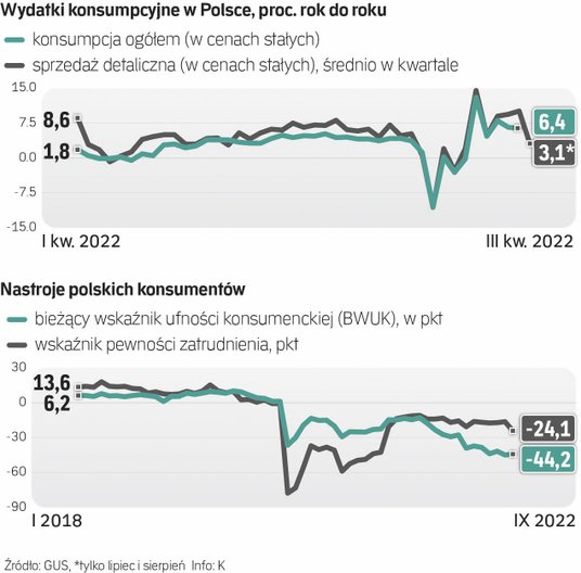 Jak podał w środę GUS, tzw. bieżący wskaźnik ufności konsumenckiej, który odzwierciedla oceny i oczekiwania gospodarstw domowych, dotyczące ich sytuacji finansowej oraz stanu gospodarki, a także skłonność konsumentów do dokonywania ważnych zakupów, wzrósł we wrześniu do minus 44,2 pkt z minus 44,9 pkt w sierpniu, gdy był najniżej w historii badań GUS. Jednocześnie ostro, z minus 30,8 pkt do minus 33,2 pkt (to najniższy poziom od maja 2020 r., gdy gospodarka była paraliżowana restrykcjami związanymi z Covid-19), spadł tzw. wyprzedzający wskaźnik ufności konsumenckiej. Przyczynił się do tego gwałtowny spadek wskaźnika pewności zatrudnienia, który – jak zauważył Grzegorz Ogonek, ekonomista z Santander Bank Polska – do tej pory był zaskakująco stabilny i nie reagował na rosnące prawdopodobieństwo recesji. Na nastroje gospodarstw domowych wpływała negatywnie najwyższa od ćwierćwiecza inflacja, ale nie obawy o utratę pracy.