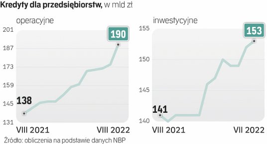 Szczególnie wysoką dynamikę widać po stronie kredytów operacyjnych (wzrost r./r. o ok. 55 proc. w przypadku dużych przedsiębiorstw i ok. 20 proc. w przypadku małych i średnich przedsiębiorstw). Dynamicznie rośnie też wartość finansowania dla inwestycji (odpowiednio 11 i 4,5 proc.), co może być nieco zaskakujące w obliczu nadchodzącego spowolnienia.
