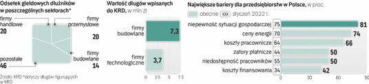 Wśród giełdowych dłużników najwięcej jest firm handlowych, przemysłowych i budowlanych. W ujęciu wartościowym ta ostatnia branża ma największe długi. Drugie miejsce przypada firmom zajmującym się telekomunikacją i technologiami informatycznymi. Z kolei przedsiębiorstwa handlowe mają najwięcej nieuregulowanych zobowiązań oraz najliczniejszą grupę wierzycieli.