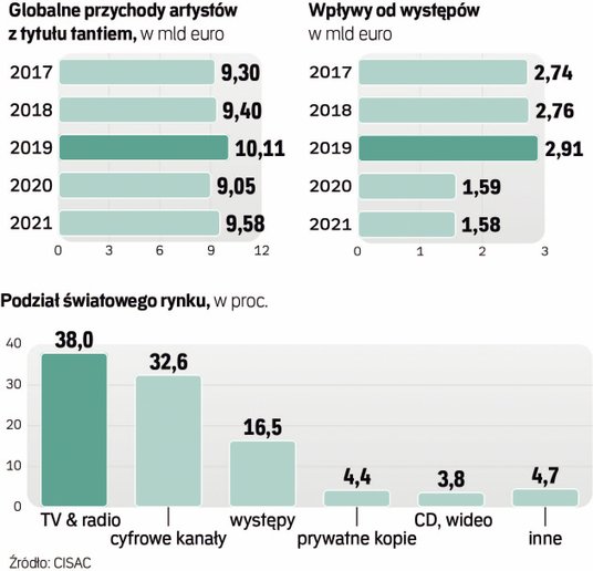 Także muzycy są poszkodowani. – Tantiemy dla twórców i autorów spadają, streaming nie jest w stanie tej luki wyrównać. Odpowiedzią byłyby opłaty reprograficzne, np. od smartfonów i innych nośników, jednak resort kultury tematu nie podejmuje. Tymczasem tylko nieliczni artyści mogą odrabiać straty występami na żywo, ponad 85 proc. twórców otrzymuje dochody w wysokości średniej krajowej, więc nie ma mowy o majątkach – mówi Marek Kościkiewicz, autor tekstów, muzyk, wokalista. – Środowisko rozmawia, jak urealnić wpływy ze streamingu, obecnie są one niesłychanie niskie, a wielu twórców z tego tytułu nie otrzymuje niczego. Mamy nadzieję, że coś uda się zmienić – dodaje.
