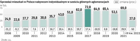 Według szacunków REDNET Consulting w sześciu największych miastach w III kwartale br. deweloperzy sprzedali 6,8 tys. mieszkań – o 51 proc. mniej niż rok wcześniej i 23,5 proc. mniej niż w II kwartale br. Załamanie to efekt wysokich stóp procentowych i niedostępności kredytów mieszkaniowych. Mieszkania kupują dziś głównie posiadacze gotówki: rynek najmu sprzyja, a wysoka inflacja zachęca do lokowania kapitału.