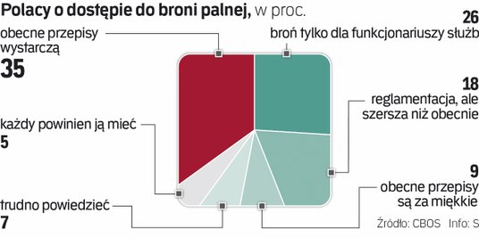 Takie zachowania pokazują, że Polacy chcą się chronić, ale w ramach obecnych przepisów. Mimo ogromnego wzrostu zagrożenia bezpieczeństwa nie rośnie wcale przyzwolenie na liberalizację obecnych dość rygorystycznych zasad uzyskania pozwolenia na broń. Z niedawnego sondażu CBOS wynika, że 35 proc. badanych uważa obecne przepisy za wystarczające, a 26 proc. wręcz twierdzi, że broń powinni mieć tylko funkcjonariusze służb mundurowych.