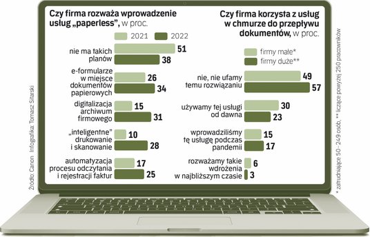 Polskie firmy odchodzą od papieru, przynajmniej w sferze deklaracji. Jeszcze w zeszłym roku 51 proc. rodzimych przedsiębiorstw nie interesowało wdrażanie rozwiązań tzw. paperless, ale – m.in. dzięki pandemii – procesy digitalizacji ruszyły z kopyta. Jak wynika z najnowszych badań firmy Canon, które „Rzeczpospolita” publikuje jako pierwsza, dziś na zastępowanie tradycyjnego obiegu dokumentów cyfrowymi usługami postawić zamierza niemal 2/3 podmiotów w naszym kraju.