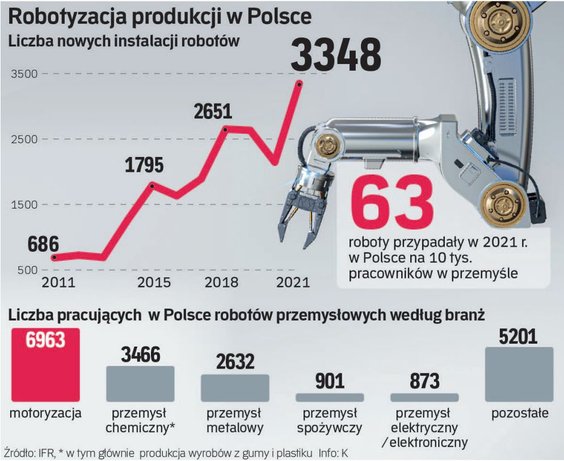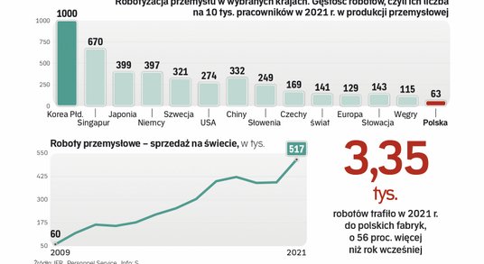 Ubiegły rok był rekordowy pod względem tempa robotyzacji produkcji przemysłowej w Polsce i na świecie. W naszym kraju zainstalowano ponad 3,34 tys. nowych robotów, czyli aż o 56 proc. więcej niż w 2020 roku i najwięcej od ponad dekady. Z kolei na świecie przybyło łącznie ponad 517 tysięcy nowych robotów, co o 31 proc. zwiększyło ich łączną liczbę do prawie 3,5 miliona – wynika z najnowszego raportu Międzynarodowej Federacji Robotyki, do którego dotarła „Rzeczpospolita”.