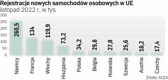 Z danych ACEA wynika, że do poprawy sytuacji przyczyniła się większość unijnych rynków, w tym największych, zwłaszcza niemieckiego. Listopad przyniósł tam wzrost rejestracji o prawie jedną trzecią: ze 198,3 do 269,5 tys. aut. To przeszło trzykrotnie większy wzrost w porównaniu z Francją (9,8 proc.) i przeszło dwukrotnie większy niż we Włoszech (14,7 proc.). Polska, choć z piątym wynikiem sprzedażowym w UE, potencjał wzrostu ma jednak zdecydowanie słabszy. Sprzedaż na poziomie 34,2 tys. sztuk dała nam wzrost r./r. o 7 proc. To daleko poniżej średniej unijnej.