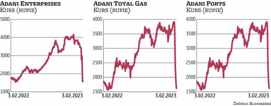 Przed publikacją raportu Hindenburg Research nazwisko Adaniego bardzo rzadko pojawiało się w polskich mediach. A szkoda, bo był on najbogatszym miliarderem z rynków wschodzących, a jego fortuna rosła w niewiarygodnym tempie. Na początku 2023 r. sięgała ona około 120 mld dol., a przez poprzednie trzy lata powiększył on ją aż o 100 mld dol. Taki skok wartości majątku był możliwy dzięki dużym zwyżkom cen akcji siedmiu spółek z jego grupy. Średnio zyskały one w tym okresie 819 proc. Mowa nie o indyjskich odpowiednikach Ubera czy Netflixa, ale o firmach z bardziej tradycyjnych branż. Najmocniej spośród nich zyskała w ciągu ostatnich trzech lat firma Adani Total Gas zajmująca się dystrybucją gazu ziemnego. Jej akcje zdrożały w tym okresie aż o 2121 proc. Papiery Adani Enterprises zajmującej się głównie produkcją węgla i rudy żelaza (ale mająca spółki zależne w różnych branżach – od rolnictwa po przemysł zbrojeniowy) zyskała 1398 proc. Najskromniej urosły akcje Adani Ports, największego indyjskiego operatora portów, które zyskały 98 proc.