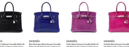 Bleu Jean Shiny Porosus Crocodile Birkin z 2006 roku z 18-karatowym białym złotem i diamentowymi elementami został sprzedany za ponad 1,5 miliona HKD (190 000 USD), co czyni go najdroższym przedmiotem aukcji. Kolejny Bleu Electrique Shiny Porosus Crocodile Birkin z 2014 r. został sprzedany za nieco ponad 1 miliona HKD – przed aukcja torebka była wyceniana na 500 000 - 700 000 HKD.