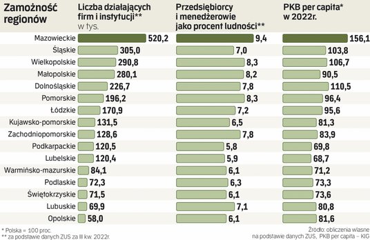 Informacje o aktywnych firmach i instytucjach posiada Zakład Ubezpieczeń Społecznych – to płatnicy składek ubezpieczeniowych. Z danych tych wynika, że najwięcej firm działa na Mazowszu, a najmniej w woj. opolskim. Jednak tak jak Mazowsze jest liderem PKB liczonego na mieszkańca – w ub.r. było to ponad 156 proc. średniej krajowej, tak w woj. opolskim PKB per capita wyniósł 81,6 proc. średniej. To dziewiąty regionalny wynik w kraju.