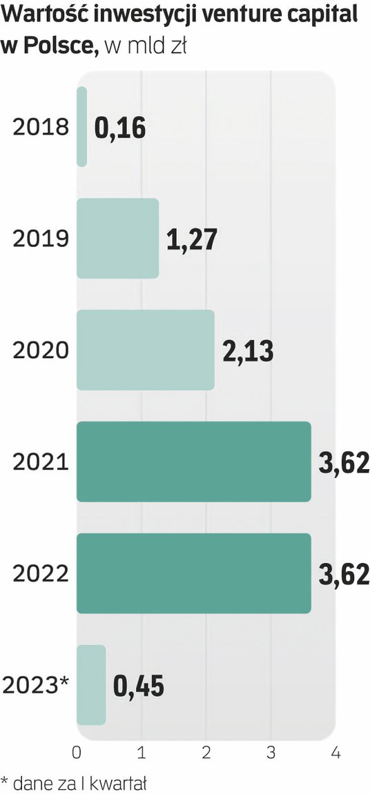 Tak źle na rynku młodych, innowacyjnych spółek w naszym kraju jeszcze nie było. Jeszcze w I kwartale 2022 r. do rodzimych firm technologicznych popłynęło od funduszy VC 1,16 mld zł, a za te pieniądze sfinansowano rozwój 98 projektów. Teraz jednak inwestorzy nie są skorzy do sięgania aż tak głęboko do kieszeni. W efekcie, jak wskazuje Polski Fundusz Rozwoju, po pierwszych trzech miesiącach 2023 r. wartość inwestycji wysokiego ryzyka w Polsce wyniosła jedynie 446 mln zł. To istna zapaść. Strumień z pieniędzmi od inwestorów stopniał rok do roku o ponad 61 proc. Choć pozornie mogłoby się wydawać, że ruch w biznesie nie zamarł, bo sfinansowano rozwój 127 start-upów (o 30 proc. więcej niż w I kw. 2022 r.), to w praktyce nie ma powodów do zadowolenia. Wartość tych transakcji poleciała bowiem na łeb – średnia kwota, jaką zasilono start-up, spadła z blisko 12 mln zł do 3,5 mln zł (a więc o 70 proc.).