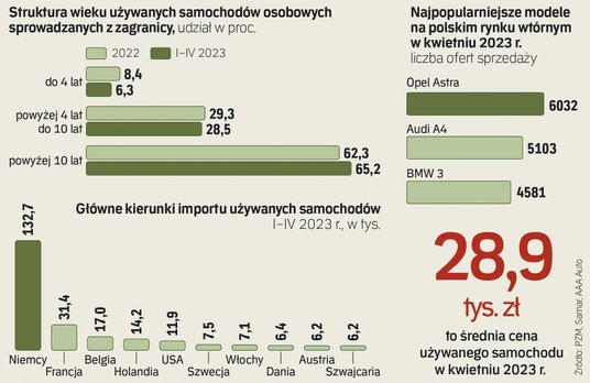 Polski rynek samochodów od lat się starzeje, średnia wieku to ok. 14 lat. Jeszcze w 2010 r. udział ponad 10-letnich samochodów w łącznej liczbie używanych aut sprowadzanych z zagranicy wynosił 43 proc. Dziesięć lat temu było to niewiele ponad 48 proc,. w roku ubiegłym już ponad 62 proc. Natomiast dane Polskiego Związku Przemysłu Motoryzacyjnego pokazują, że w pierwszych czterech miesiącach 2023 r. odsetek najstarszych aut sięgnął już 65,2 proc. W przypadku najmłodszych samochodów tendencja jest odwrotna: udział w prywatnym imporcie aut mających mniej niż cztery lata stopniał do obecnych 6,3 proc. z przeszło 11 proc. w 2010 r.