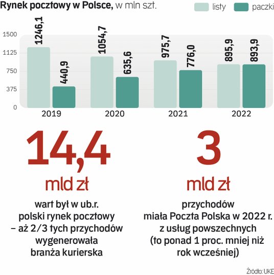 Zapaść na rynku listów w Polsce pogłębia się – jak wynika z najnowszego raportu Urzędu Komunikacji Elektronicznej (UKE), popyt na te usługi w 2022 r. kolejny rok z rzędu mocno się skurczył. Na rynku obsłużono łącznie niecałe 896 mln sztuk takich przesyłek, a to o ponad 8 proc. mniej niż jeszcze w 2021 r. Biorąc pod uwagę to, że w 2021 r. spadki w tradycyjnej korespondencji sięgały 7,5 proc., zaś rok wcześniej niemal 15,5 proc., trend jest wyraźny, a przyszłość tego sektora nie wróży dobrze monopoliście – Poczcie Polskiej (PP). Tym bardziej że kolejne fundamenty spółki też kruszeją – rynek przesyłek reklamowych nad Wisłą w 2022 r. wręcz tąpnął (spadki sięgają 11 proc.), z kolei liczba realizowanych przekazów pocztowych skurczyła się w tym okresie o ponad 7 proc.