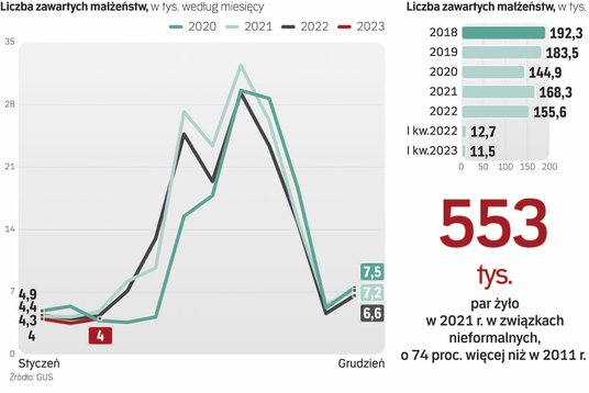 Wprawdzie rośnie segment ślubów luksusowych z budżetami powyżej 150 tys. zł (niekiedy za 500 tys. zł i więcej, a czasem powyżej miliona), ale – jak ocenia Pieczyński – ponad trzy czwarte rynku to imprezy niskobudżetowe, gdy młode pary zwykle chcą się zmieścić z wydatkami do 50 tys. zł. Nie jest to łatwe, bo dwucyfrowa inflacja, a także oczekiwania co do jakości ślubnych usług podbijają ich ceny.