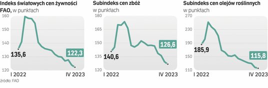 Sytuację na światowych rynkach żywności śledzi Organizacja Narodów Zjednoczonych ds. Wyżywienia i Rolnictwa (FAO). W marcu zeszłego roku, wkrótce po wybuchu wojny w Ukrainie, wyznaczany przez nią indeks światowych cen żywności sięgnął 159,7 pkt. Wykonał gigantyczny skok aż o ponad 18 pkt, czyli o blisko 13 proc., w porównaniu z lutym. Znalazł się tym samym na najwyższym poziomie w historii notowań, czyli od 1990 r. Od tego czasu jednak ceny żywności systematycznie spadają.